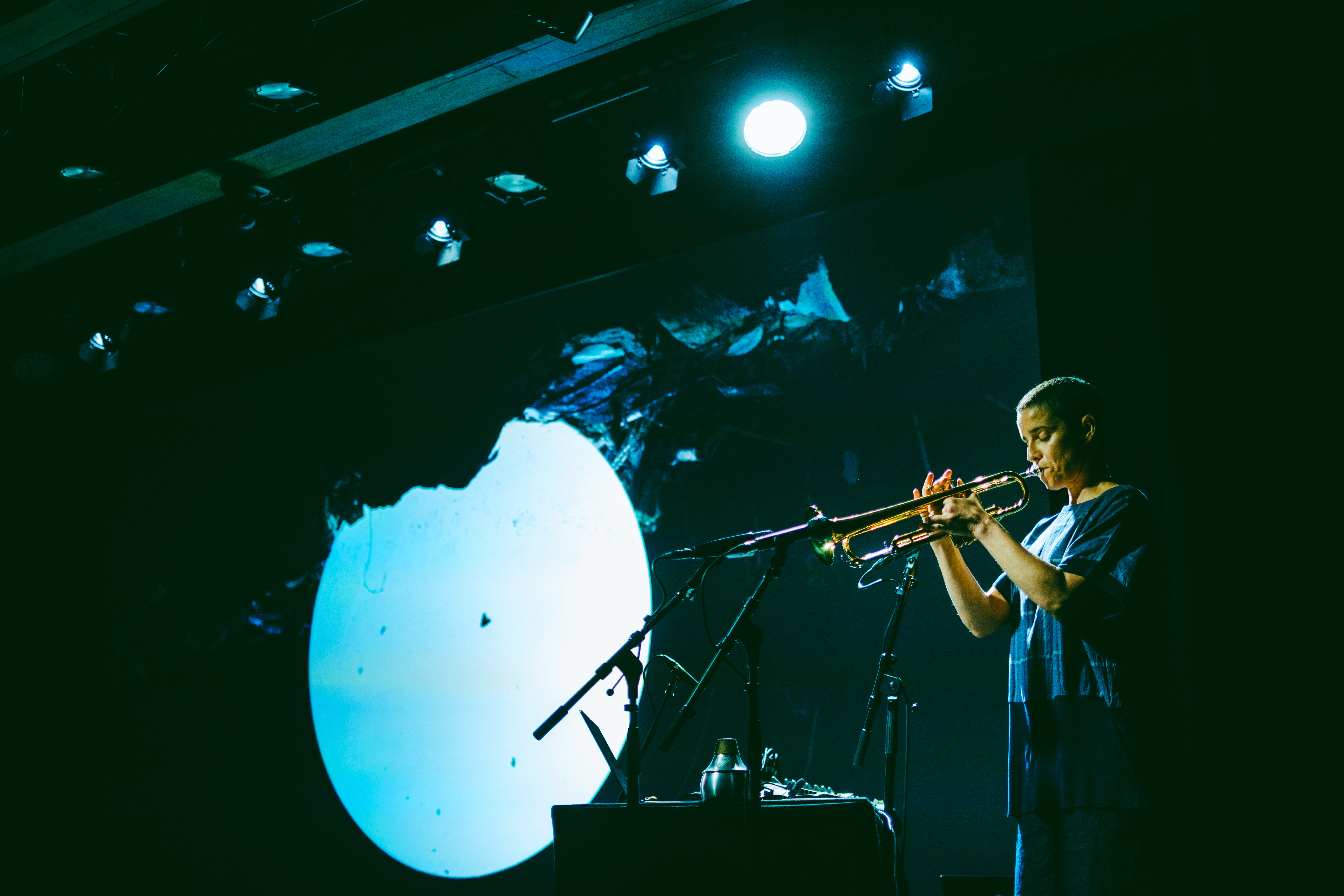 Entrou no palco discretamente, sem palmas e disparou logo o primeiro vídeo e um contínuo eletrónico agudo que iria acompanhar a primeira peça. No ecrã uma bola gigante branca (candeeiro) atraía mosquitos. O trompete severamente captado por dois microfones processavam o som de maneiras diferentes, Zumbiam agudos. A música respeitava a personalidade tímbrica e sonora do trompete com contínuos longos que de algum modo nos ligaram a “All The Rivers”, em que a trompetista improvisa com a arquitetura reverberante do Panteão Nacional.