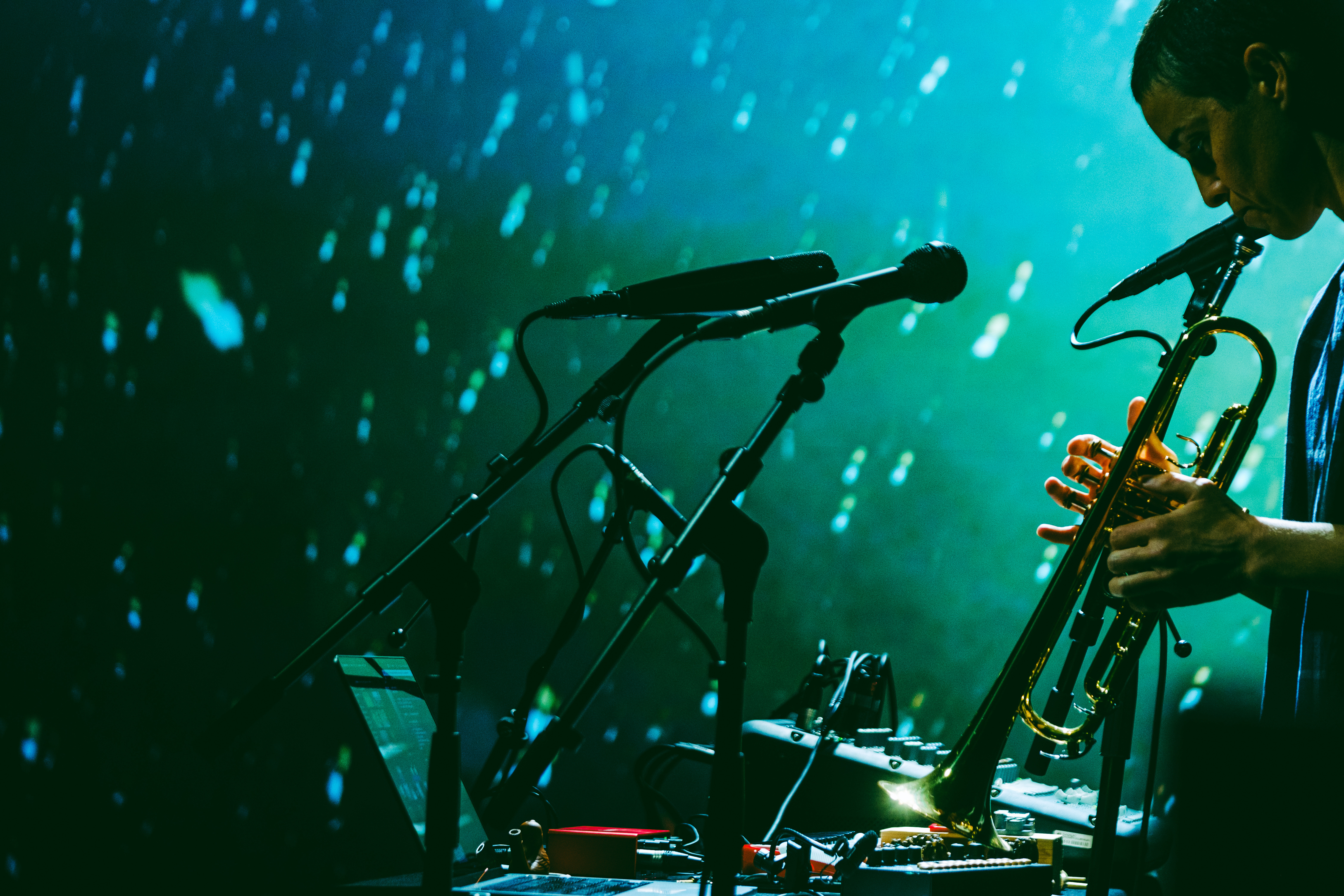 Pelo meio apareceram colagens sonoras, muita manipulação eletrónica, poesia dita/tocada num processo que parecia a quem o ouvia que tinha muito de auto-biográfico e de catártico. Muito do trabalho da trompetista foi gerir o processamento dos sons que entravam pelos microfones, muitas vezes curtos, que era infinitamente prolongados eletronicamente.Lembrámos os concertos/histórias/psicanálise de Laurie Anderson, cuja beleza musical e visual é imensa e interdependente.